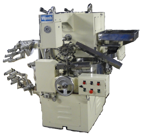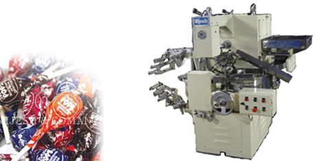 The Lolipops are charged in to the S.S. Hopper from where it is released on to the rotary format by an automatically controlled vibrator. The paper flows from the paper feed station, cut to appropriate length & the Lolipops are lifted along with folded wrapper in to the twisting turret. The Lolipops are held in position by the rubber gripper and the twisting operation is performed mechanically by twisting fingers on both sides & then it is further collected from delivery chute.