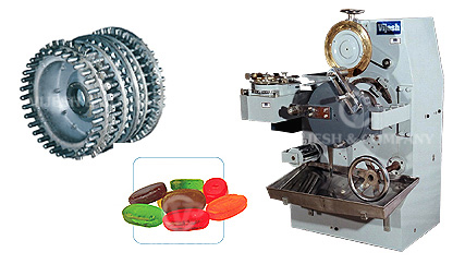 The machine mainly consist one set of sizing wheels & tablet forming die. The rope from rope sizer machine enters in this sizing wheel and then into the tablet forming die to get the required shape of Candy as per die. to get required shape of Candy as per die. It is suitable for forming seamless sweets with high depth and thickness. The new version of Tablet Forming Machine (Plast-o-Plast) is designed with spring type die with bigger & robust punches.